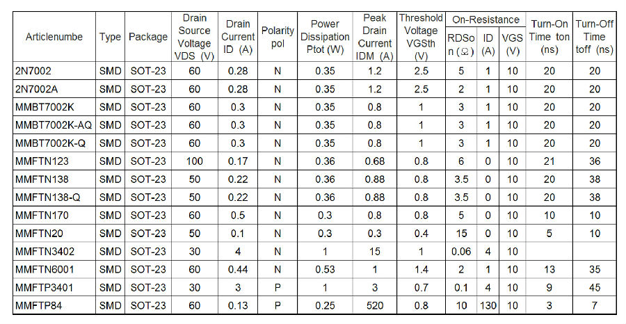 SOT-23(2N70002N7002,MMBT7002K,MMFTN123,MMFTN138,MMFTN170, MMFTN20,MMFTN3402,MMFTN6001,MMFTP3401,MMFTP84)